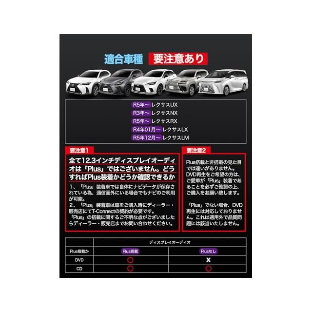 ●適合車種一覧:令和5年からの新型レクサスUX/令和3年からの新型レクサスNX/令和5年からの新型レクサスRX/令和4年1月からの新型レクサスLX600/令和5年12月からの新型レクサスLM。純正ディスプレイオーディオPlus搭載するモデルはDVD・CDの再生となります。Plusが無いモデルはCDの再生となります。日本国内市販のDVD・CDのみ対応、ブルーレイDVD・CPRMが再生できかねます。走行中映像を見るにはTVキャンセラーが必要です。車の相性やディスクの年式・劣化・状態・フォーマットなどによって日本市場向けのDVDでも再生できない場合があります。TVキャンセラーまたは車の相性で再生できない場合があります。万が一不備・破損等ございましたら、商品到着後7日以内にお手数ですが当店「お問い合わせ・アフターサービスサポート」までご連絡をお願い致します。