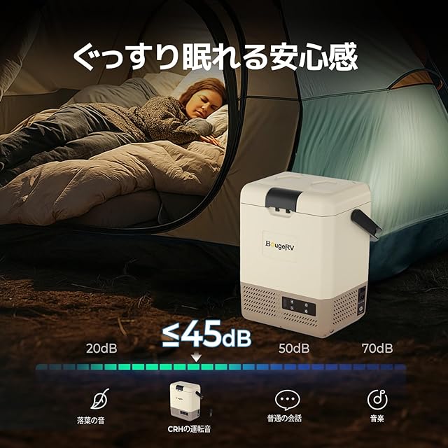 【専用アプリで快適操作&LEDコントロールパネル】 BougeRV専用アプリを使えば、冷蔵庫の温度や設定をスマートフォンから簡単に操作できます。本体に近づく必要がなく、テントや車内からでも手軽に管理可能。最大10mの範囲で操作できるため、アウトドアシーンや車中泊でも快適に使用できます。さらに、シンプルで分かりやすいLEDコントロールパネルを採用。温度設定や動作状況が一目で確認できるため、初めて使う方でも迷わず操作できる直感的なデザインです。