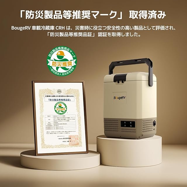 本製品は「防災製品等推奨品マーク」を取得しました。【抜群の携帯性&省スペース設計】 この車載冷蔵庫は、幅約39.5cm×奥行約23.6cm×高さ約44.9cm、重量わずか8.8kgという驚きの軽さとコンパクトさを兼ね備えています。便利なハンドル付きで、片手でラクラク持ち運びが可能!車内での設置場所にも困らず、センターコンソールや助手席、後部座席の間など、限られたスペースにもスムーズに収まり、車内空間を有効活用できます。さらに、冷蔵庫のトップ部分には防滑加工が施されたカップホルダーを搭載。飲み物を置いても滑りにくく、安定感抜群です。キャンプやピクニックといったアウトドアシーンでも安心して使用できる、空間活用と機能性を両立します。