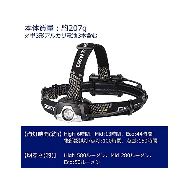 明るさ:High/580ルーメン・Mid/280ルーメン・Eco/50ルーメン、使用電池:単3形アルカリ電池×3本