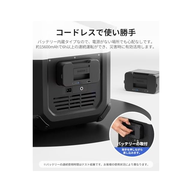 【非常時に電源なしでも使用可能】15600mAhの大容量バッテリー(別売り)が内蔵可能なので、コードレスで使用できます。電源がないキャンプサイトや釣り場で食材の風味や色も長くキープします。突然の災害で長期停電になった場合でも有効活用できます。停車時にエンジンが切ると、電源をバッテリーに自動的に変更し、作動し続けられます。しばらく車から離れてスーパーの買い物で刺し身、冷凍食品や暖かい飲み物を買っても安心です。