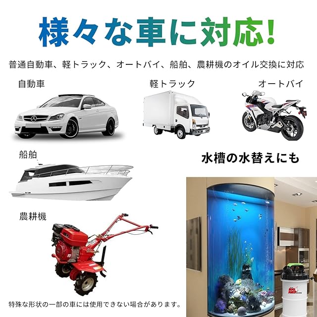 【適用範囲が広い】:エンジンオイルやトランスなどの抽出・水槽などの水替えに使える手動式オイルチェンジャー。車、船、バイク、機械のオイル交換に最適で、水などの液体を抽出することもできます