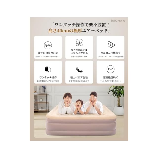 【2025年最新版・花見キャンプに大人気!】BOOMAX エアーベッド 2025年モデルが新登場!大容量4000mAhバッテリー搭載で、充電1回で4~6回使用可能。電動ポンプならワンタッチで簡単設置、たった2~3分でふかふかのベッドが完成!独自の空気調節システムで硬さも自由調整。Type-C充電対応の多機能ポンプ(弱光/強光/SOSライト付)で、災害時やキャンプでも大活躍。春のお花見から夏のキャンプまで、快適なアウトドアライフをサポートします!