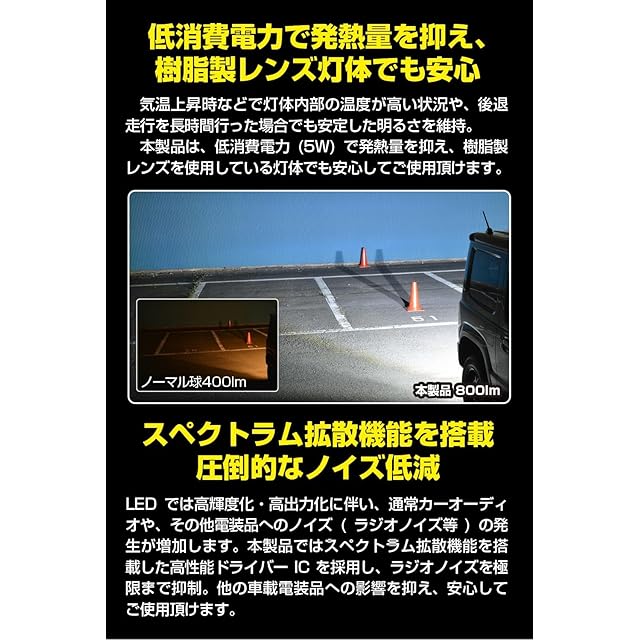 驚異の全光束800ルーメン 超高効率新型LED×9個搭載 純正球比、約3倍の明るさ 集光レンズ採用で光が遠くまで届く 定電流回路内蔵で常に一定の明るさを持続 突発的な過電流トラブルを回避する保護素子を内蔵 温度マネージメント機能・高熱伝導・放熱素材を採用し、超ハイルーメン&長時間変わらぬ明るさを実現