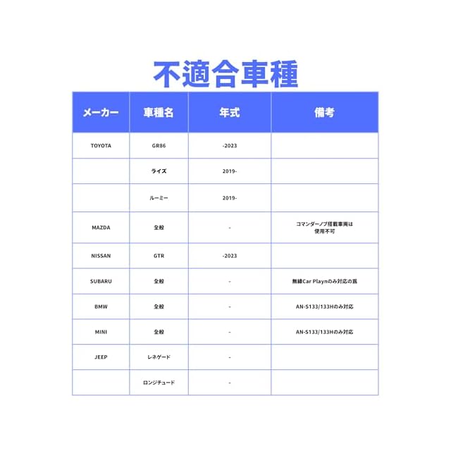 APPCAST対応車両の確認ポイント この製品を使用する前に、以下の条件を満たしているか確認してください。 対応車両の条件 1.有線接続のApple CarPlayが搭載されていること。(無線接続のApple CarPlayのみの車には対応していません。) 2.お車にUSBの差込口があり、通信に対応していること。 3.ディスプレイオーディオがタッチパネル式であること。 4.純正の後席用フリップダウンモニターは使用できません。 5.市販のカーナビやディスプレイオーディオ(純正品以外)は対応していません。 上記の条件を満たしている場合、弊社では対応車両として販売しておりますが、すべての車両での実車確認が完了しているわけではありません。 動作確認をご希望の方へ ご購入前に動作確認をご希望の場合、弊社にてデモ機をご用意しております。 ご希望の方は、お気軽に弊社HPよりご連絡ください。 注意事項 ・運転中の操作はお控えください。 走行中に操作すると前方不注意となり、事故の原因になります。 必ず安全な場所に停車してから操作してください。 ・本製品をご使用の際は、必ず付属のケーブルをご利用ください。 付属ケーブル以外を使用した場合の動作はしておらず、弊社ではサポート対象外となります。 ・一部のディスプレイオーディオにおいて、画面上部に白い線が表示される場合がございます。 こちらは画角調整の都合によって生じるものであり、製品の異常や不具合ではございません。 ご不明な点がございましたら、お問い合わせください。