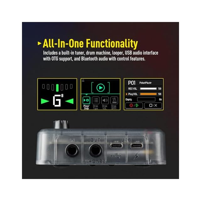 SONICAKE ポケットマスターギターベースアンプモデリングIRキャビネットシミュレーションマルチエフェクトステレオOTG USBオーディオインターフェイスBTオーディオ1.75インチLCDカラースクリーン 透明ブラック