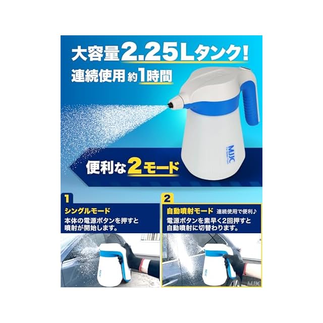 [MJJC フォームマスター] 電動フォームガン 充電式 洗車用品 コードレス 自動泡噴霧器 2.25L 大容量 ボトル (単品(ホワイトブルー))