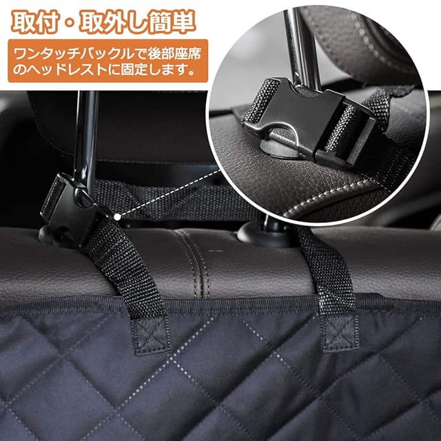 【使いやすい】2ステップで取付完了!! まず、後部座席のへッドレストにワンタッチバックルを掛けます。次は、裏面のマジックテープをお使い、マットを荷台に固定します。取扱書が付属されておりますので、取付・取り外しは簡単!