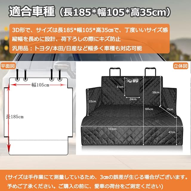 【撥水対応】600Dのオックスフォード撥水生地で、水が弾き、細かく水は殆ど通さない。濡れた荷物例え傘/キャンプ道具なら染み込む事はない。ただし、本ラゲッジマットは厚手タイプなので、耐磨耗性と耐久性が高くなります。水・毛、泥、汚れ、キズから愛車を守ってくれます。
