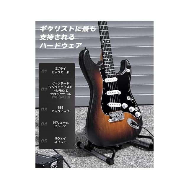 【SSSピックアップ構成】3つのシングルコイルピックアップと5ウェイセレクターが、幅広いジャンルに対応する明るくダイナミックな音を提供します。