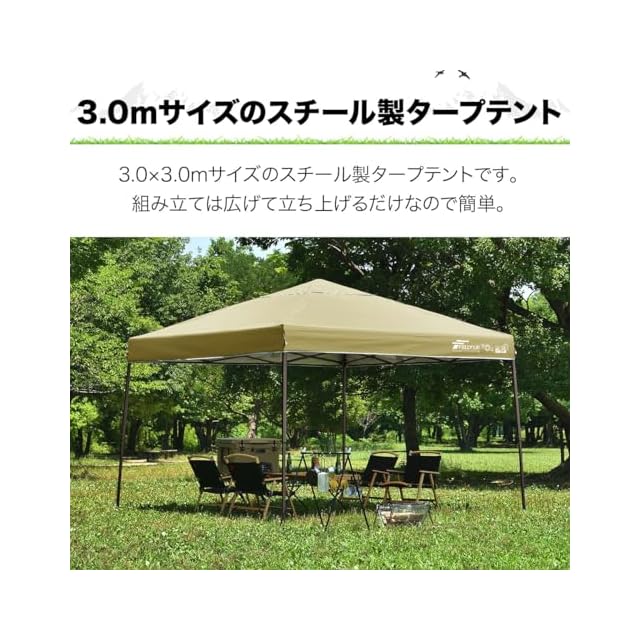 ✅【3.0mスチール製タープテント】3.0×3.0mサイズのスチール製タープテントです。 生地は遮光率100%の完全遮光・UVカット率は99.8%!✅【完全遮光のタープテント】遮光PUコーティング生地を採用した完全遮光タイプ。 光を通さないので強い日差しの日にオススメ。