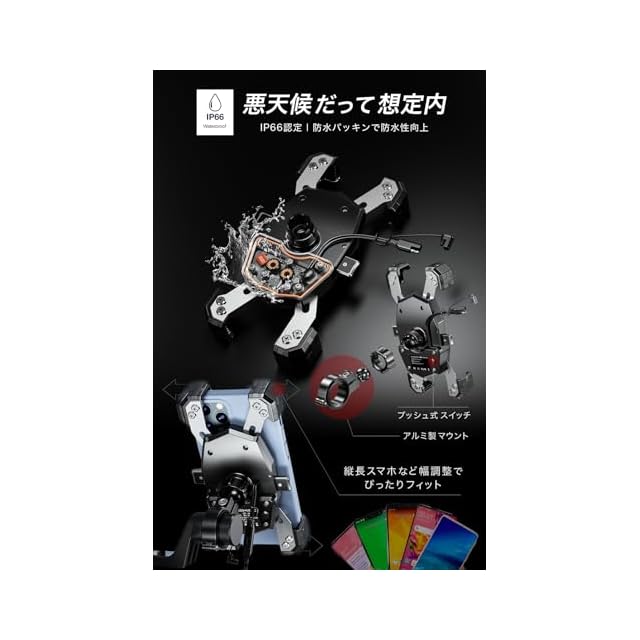 ■ご注意:■ワイドアジャスター構造でアームの横幅が調整できることで縦長のスマートフォンにも対応する事ができます。■最大15mmの厚さに対応できるので、今まで対応できなかった厚みがあるスマートフォンにも対応することができます。■iPhone11シリーズはワイヤレス充電をしながら、正確なGPSを表示できない場合があります。iOSの更新で解消される事があります。■スマホケースに金属や磁気が含まれているとそれを検知し、安全のためプロテクションが作動して停止します。スマホケースが分厚い場合はワイヤレス充電の飛距離が足りなくなり充電がされなくなります。■万一に備え、セーフティーバンドKDR-SFB-Cをご活用頂く、もしくはストラップKDR-SFB-S、カラビナなどを活用し、ホルダーセット後にハンドルと繋げる事で不測の事態に備える事をおすすめしています。