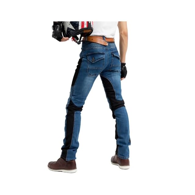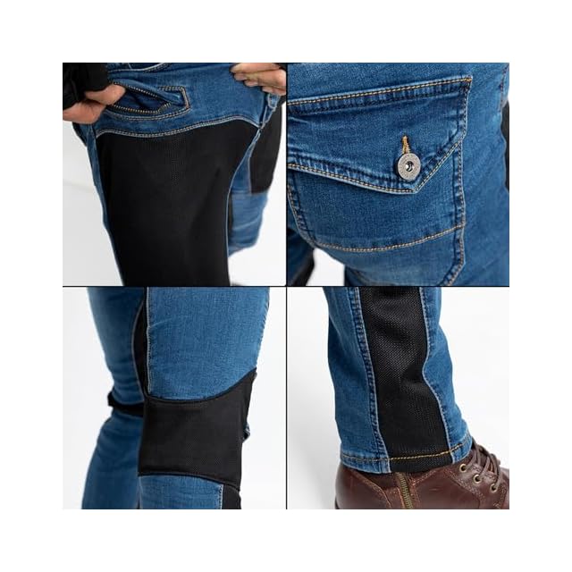 【通気性抜群】表地にはストレッチデニムを使用し、ベーシックなルックスながら高い快適性と保護性能を備えています。フロント、太腿などは前後にメッシュ付きで通気性あり、夏用にも快適!