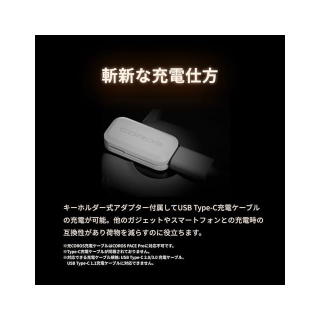 【USB Type-C 充電に対応】COROS PACE Proは充電ポートを改良され、付属のキーホルダー式アダプターでUSB Type-C 充電ケーブルの充電が可能。他のガジェットやスマートフォンとの充電時の互換性があり荷物を減らすのに役立ちます。※Type-C充電ケーブルが同梱されておりません。元COROS充電ケーブルはCOROS PACE Proに対応不可です。対応できる充電ケーブル規格: USB Type-C 2.0/3.0 充電ケーブル、USB Type-C 1.1充電ケーブルに対応できません。