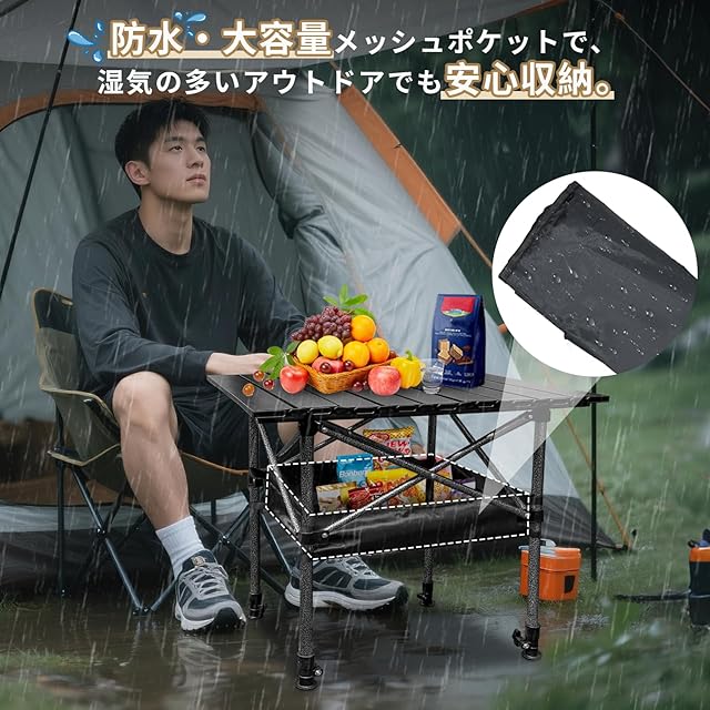 【便利なメッシュ収納】 天板下には取り外し可能な大容量メッシュ収納を装備します。スマホや食器、調味料などの小物を収納可能です。撥水素材を採用し、夜露や湿気から物を守ります。取り付け・取り外しが簡単で、使用しない時はコンパクトに折りたたんで収納できるのも魅力です。