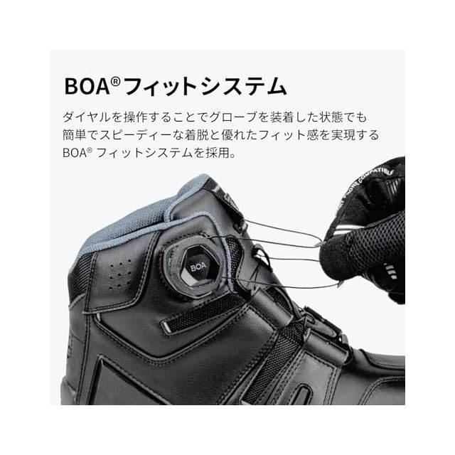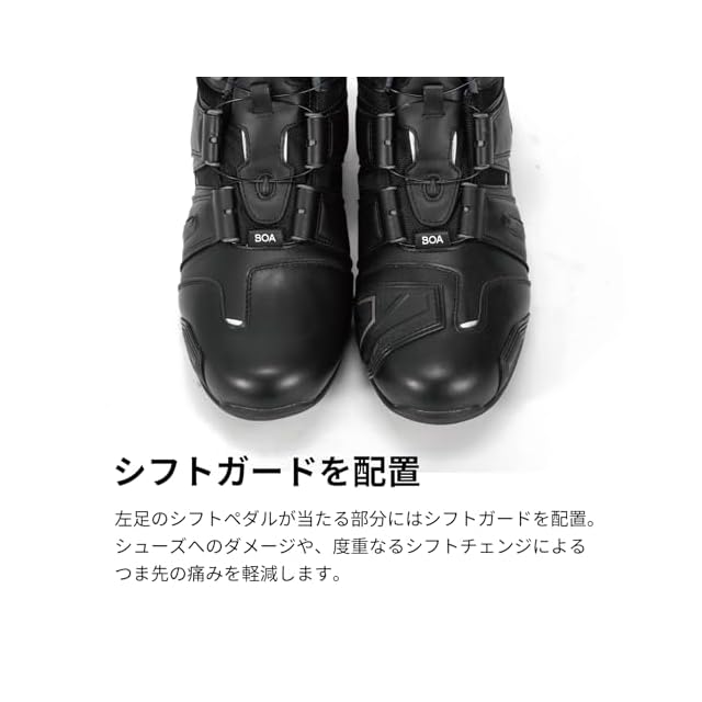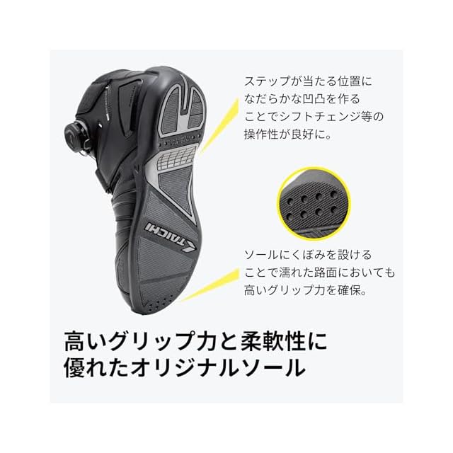 アッパー内部にはTAICHIオリジナルの防水・透湿素材"ドライマスター"を採用し、全天候での使用に対応。着脱のしやすさと優れたフィット感を実現するBOAフィットシステムを採用。ソールには高いグリップと柔軟性に富むオリジナルソールを採用し、衝撃吸収材を内蔵したインソールとの相乗効果により、ライディング時はもとより、歩行時にも抜群の履き心地を実現。デニムはもちろんのこと、レザーパンツにもマッチする次世代のライディングシューズです。