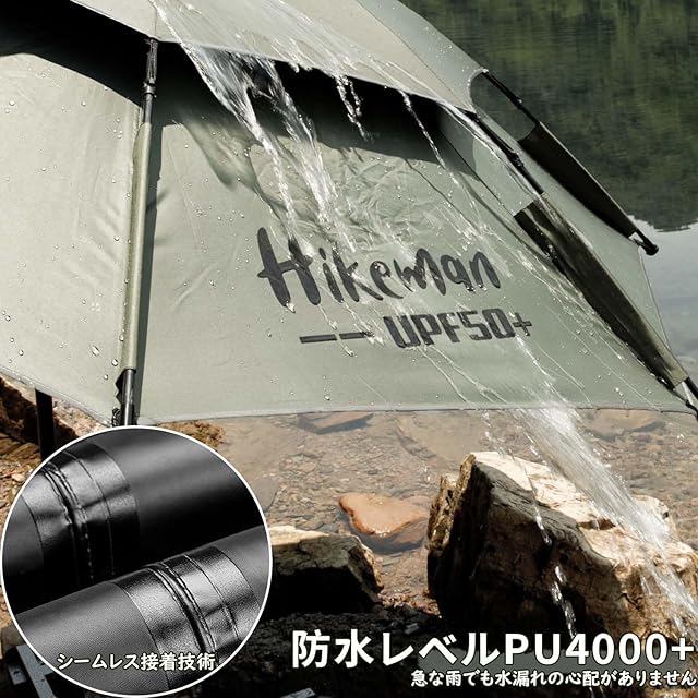PU4000+の防水性:このフィッシングパラソルは防水レベルPU4000+の素材を採用しており、さらに裏面は防水テープ加工済みです。大型のサイズでアウトドアで急に大雨に降られたときでも水漏れの心配がなく、雨から荷物や食料を守り、より安心にお釣りができます。