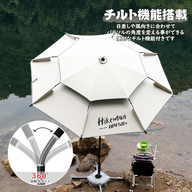 チルト機能&ブラックコーティング加工:時間とともに変化する日差しの向きに合わせて360度角度調整できるパラソルです。UVカット加工の表面に遮光率100%の裏面ブラックコーディングで、暑い夏でも快適な空間を作ってくれます。釣り用パラソルとしては勿論、ガーデンパラソルとしても最適です。