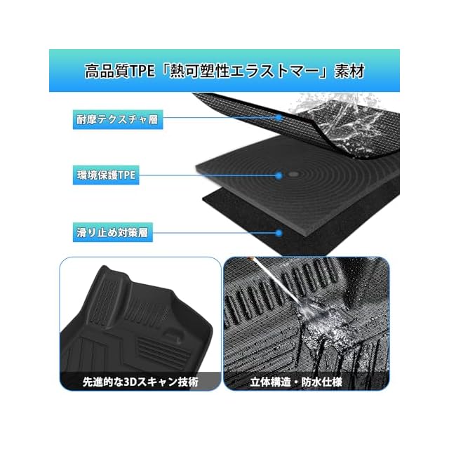 2.【高品質TPE素材】:摩擦性に優れたTPE樹脂素材を採用し、耐汚れと耐摩擦性を実現しました。3D立体構造のお掛けで車が運転している途中でも、飲み物などが溢れっても水やジュースなどはフロアマットの外への侵入を防止します。弊社のマットには防水性&耐摩擦性に優れた、変な匂いも無し、お手入れも楽々!