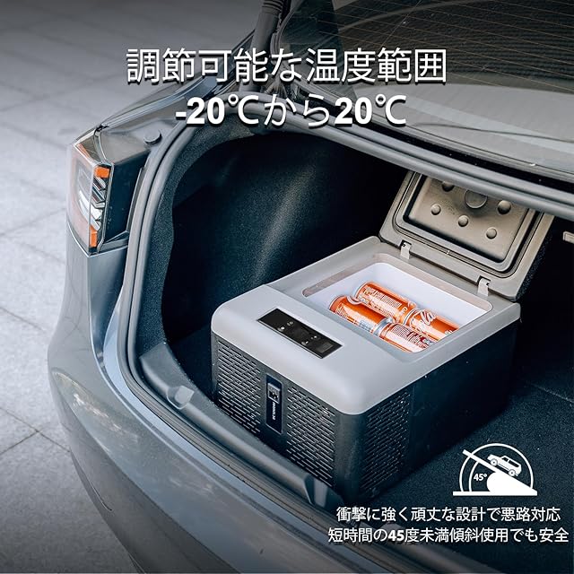 【堅牢設計と静音動作】 ショックプルーフ設計により、荒れた道や急な段差でも耐久性があり、最大45°の傾斜にも対応可能。旅行中の不安定な状況でも、車載冷蔵庫はしっかりと機能します。さらに、動作音は45db以下と非常に静かで、静かな環境でも快適に使用できます。冷却速度を重視した「速冷モード」と、省エネを意識した「省エネモード」を切り替えられるため、状況に応じて最適な運転が可能です。