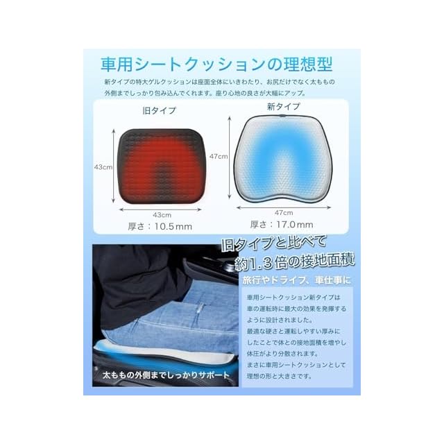 ✅【特大の車用シートクッションが運転姿勢をしっかりサポート】新タイプの特大ゲルクッションは47cm×47cmの特大サイズで車のシート座面全体をカバーし、お尻だけでなく太ももの外側までしっかり包み込んでくれます。そのため体との接地面積が旧タイプよりも約1.5倍も向上、座り心地の良さが大幅にアップした車用のシートクッションです。