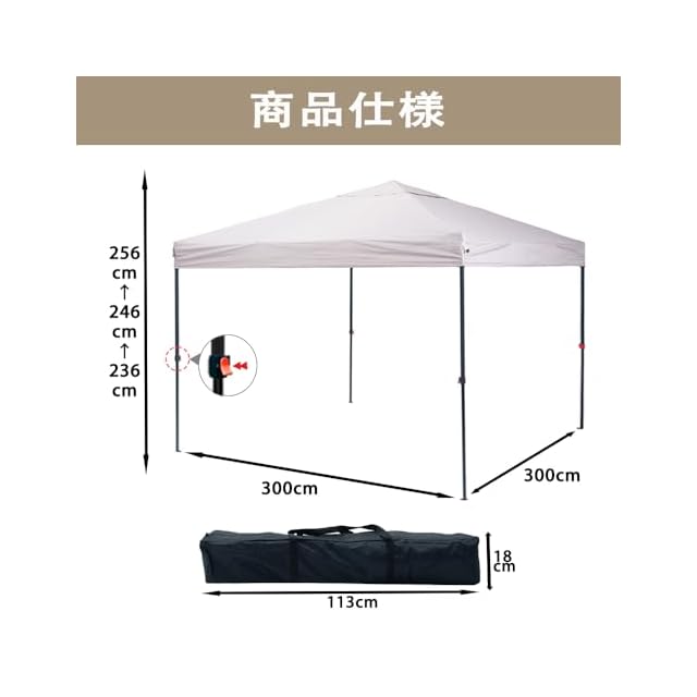 【商品詳細】サイズ 組立時 : (約)3.0m×3.0m×2.36m /2.46m / 2.56m 収納時 : (約)20cm×20cm×113cm 本体重量 :(約)10kg 材質 フレーム : スチール 生地 : 210Dオックスフォード 耐水圧 2,200mm以上 UVカッド率:97% (UPF50+) 付属品:ウエイトバック×4・ロープ×4 ・ペグ×8 ・専用収納ケース×1 ・取扱説明書(日本語)×1
