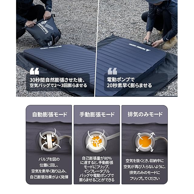 【高反発スポンジサポート・寝心地いい】厚さ10cmの高反発スポンジを充填し、弾力性と通気性に優れ、ポリエーテル素材がより活性化し、圧力の異なる状況で、異なる支える反発力を発揮することができます。 強力なサポート力、耐衝撃性、柔らかさを同時に実現し、より高い快適性を提供し、質の高い睡眠を確保します【初めて使用する場合、自動膨張スピードは遅く、数回使用すると通常の膨張スピードに戻ります。ご了承ください。】