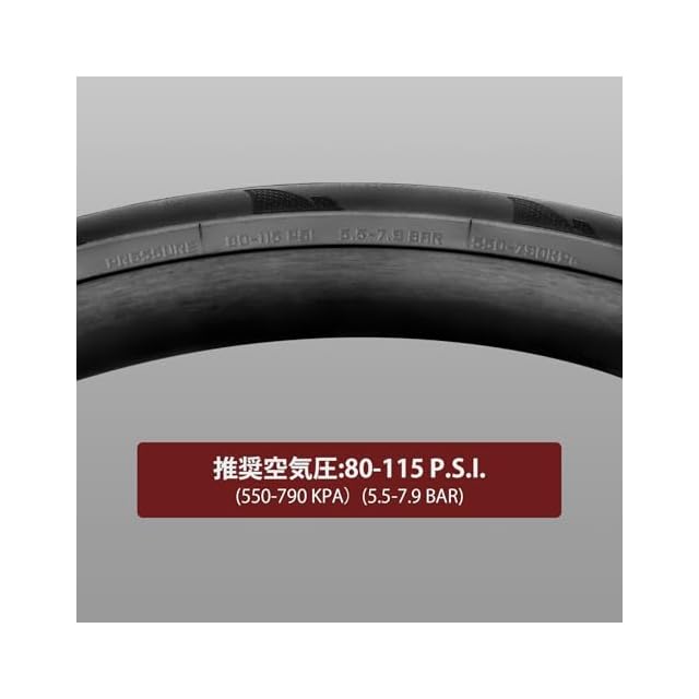 タイヤサイズ:700x28C、ETRTO:28-622mm。推奨空気圧:80-115PSI / 5.5-7.9BAR / 550-790kPa。