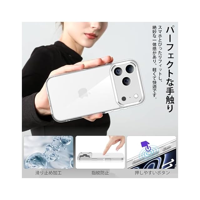 【耐摩耗性・指紋防止】このiPhone 17pro ケース最新の高級耐摩耗材質を使って、通常のPCケースよりも耐摩耗性が高く、特殊な技術処理を経て、日常の擦り傷と摩耗を効果的に防止し、ポケット・リュックサック・テーブルに置いて、長時間摩擦しても、表面に傷が残りにくいです。また、独自の指紋防止コーティング技術で、油汚れや指紋を防ぐことができ、軽くこするとすぐにきれいになり、スマホケースを長くすっきりさせることができます。