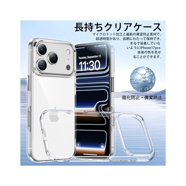 【99.9%透明度・黄変防止】透明度が新しくアップグレード!99.9%の光透過率に達す材料を使って、iPhone 17 Pro ケースの表面はUVカットコーティング処理をして、紫外線照射を効果的に防ぎ、屋外で使っても透き通った質感を保つことができ、長時間使用しても酸化黄変しません。シンプルな透明デザインで、スマホの本来の色と質感を完璧に再現することができ、写真やシールなどを入れて装飾することもでき、あなただけのスマホケースを作ることができます。