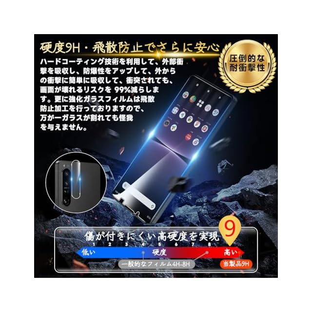【高品質の材料の9H硬度】とレンズ保護フィルムはすべて旭硝子で作られており、スマホ保護フィルムの中で最高レベルの9H硬度に達しています、4.5時間以上の高温焼入れ処理を行い、スクリーンプロテクターの圧強度は 125mpa に達し、通常 ガラス の 5 倍になりました。しかもスクリーンプロテクターは衝撃を抑えるシリコンコーティングを内蔵しており、万が一ガラスが割れても、ガラスの破片が飛散しません。ハードコーティング技術は、衝撃を最小限に抑えて画面の破損を抑え、すり傷防止や指紋防止もしっかりとスクリーンを保護します。*大切な携帯電話の液晶画面を保護し、衝撃や表面のキズを防止します。