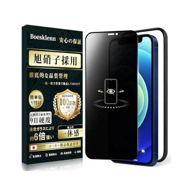 【プライバシーフィルム!覗き見防止!】 Boesklennの iPhone 12/12 Pro ガラスフィルム、日本製強化ガラス(旭硝子)を使用した硬度9Hのガラスフィルムにのぞき見防止機能追加。特別なブラインド加工により、真正面から見ると高透過率ではっきり見えますが、左右の視野からの視線を防ぎ、画面のプライバシーを守ります。角度を変えるとブラインドルーバーにより画面が段々真っ黒になり、公共の場で他人に画面を見られるのが嫌な方はぜひ使ってみて下さい!【Boesklenn永久について】製品に不具合が生じた場合は、お客様からのお問い合わせ内容に応じて代替品交換・返金対応。(お一人様につき1回限り)