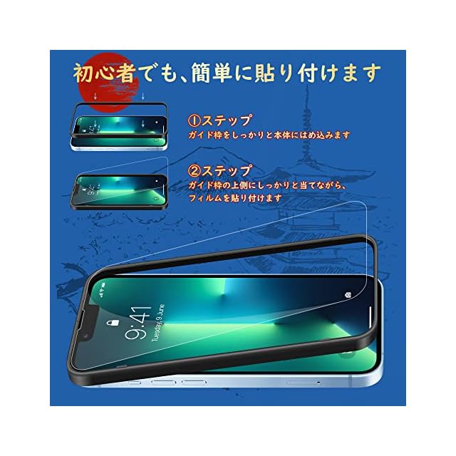 【置くだけで装着!ガイド枠付き】カスタマイズされた完璧な貼り付けガイド枠で、保護ガラスフィルムを簡単に取り付けることができ、すべての失敗の発生を防ぐことができて、ご心配を完全に解消します!グレードアップしたイオン自働吸着技術を採用して、初心者でもたった3ステップ、10秒で簡単に綺麗で貼り付けることができます!